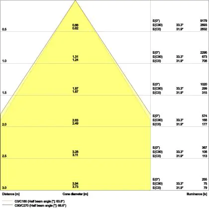 De gradenbundel geeft informatie over hoe breed het licht wordt uitgestraald. Dit zit tussen de 0 en 360 graden (D). Hoe kleiner de hoek, hoe specifieker de lichtbundel is. Over het algemeen is een smalle gradenbundel perfect voor sfeer- of accentverlichting, terwijl een brede gradenbundel ideaal is om grote oppervlaktes te verlichten.